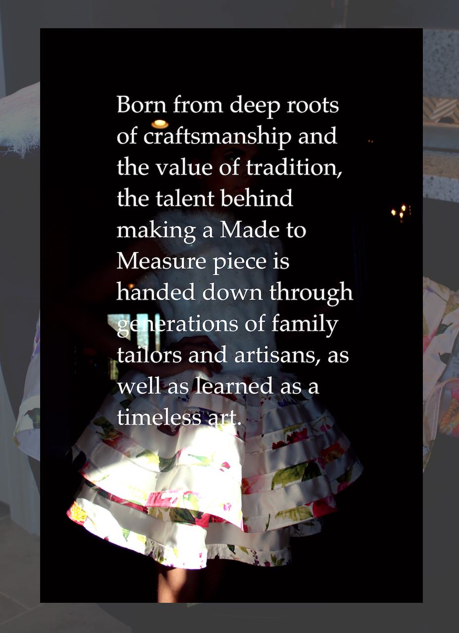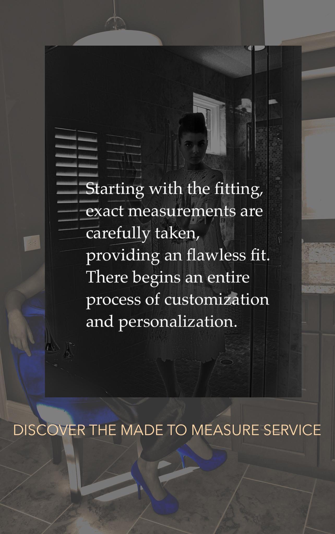 Made to Measure experience is unique, to each client. Each creation is made to accentuate the tastes of every body.